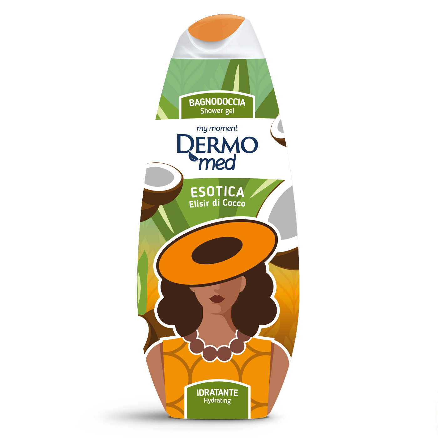 La ragazza cartoon dai ricci vaporosi e l’ampio cappello da sole evoca libertà, audacia e un mood spensierato, invitandoti a lasciarti andare. Elisir di Cocco è un bagnoschiuma cocco esotico e rigenerante, perfetto per quei momenti in cui vuoi sentirti lontana da tutto e vivere un attimo di evasione personale, caldo, dolce e profondamente rilassante.