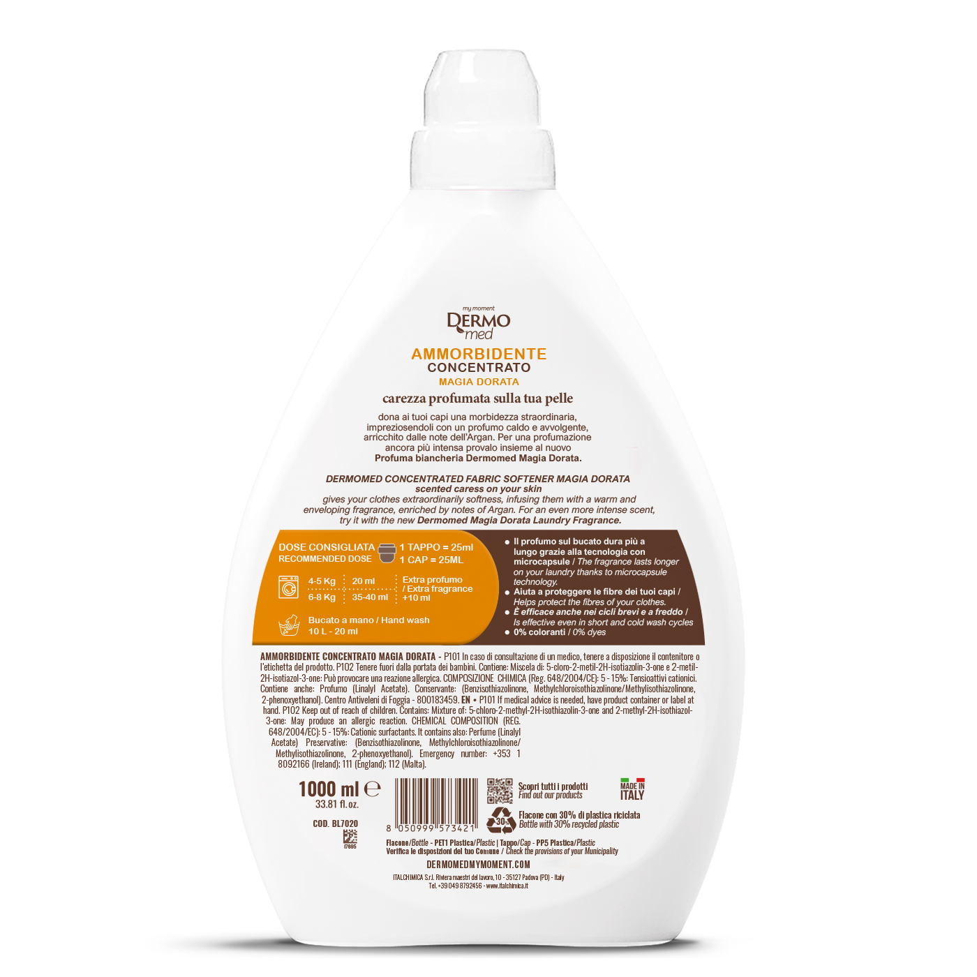 La fragranza avvolgente dell’Ammorbidente Concentrato Dermomed Magia Dorata, arricchita dalle note dell’Argan, dona ai tessuti un profumo caldo, sofisticato ed una morbidezza profonda, per un’esperienza di raffinata sensualità.