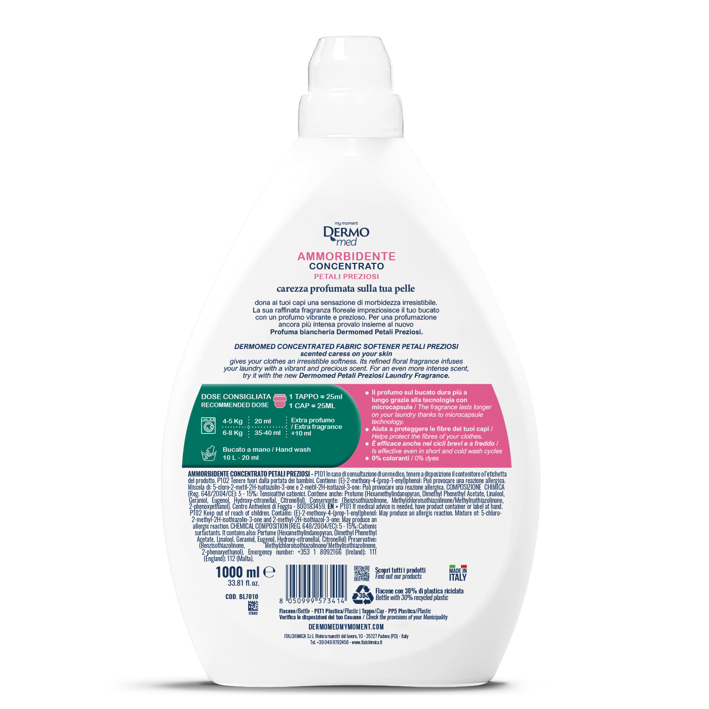 INGREDIENTS: AMMORBIDENTE CONCENTRATO PETALI PREZIOSI – P101 In caso di consultazione di un medico, tenere a disposizione il contenitore o l’etichetta del prodotto. P102 Tenere fuori dalla portata dei bambini. Contiene: (E)-2-methoxy-4-(prop-1-enyl)phenol: Può provocare una reazione allergica. Miscela di: 5-cloro-2-metil-2H-isotiazolin-3-one e 2-metil-2H-isotiazol-3-one: Può provocare una reazione allergica. COMPOSIZIONE CHIMICA (Reg. 648/2004/CE): 5 – 15%: Tensioattivi cationici. Contiene anche: Profumo (Hexamethylindanopyran, Dimethyl Phenethyl Acetate, Linalool, Geraniol, Eugenol, Hydroxy-citronellal, Citronellol). Conservante: (Benzisothiazolinone, Methylchloroisothiazolinone/Methylisothiazolinone, 2-phenoxyethanol). Centro Antiveleni di Foggia – 800183459.