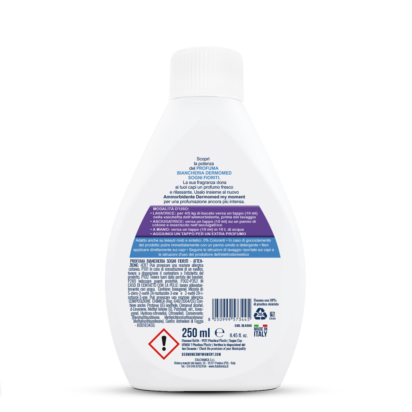 INGREDIENTS: PROFUMA BIANCHERIA SOGNI FIORITI – ATTENZIONE: H317 Può provocare una reazione allergica cutanea. P101 In caso di consultazione di un medico, tenere a disposizione il contenitore o l’etichetta del prodotto. P102 Tenere fuori dalla portata dei bambini. P280 Indossare guanti protettivi. P302+P352 IN CASO DI CONTATTO CON LA PELLE: lavare abbondantemente con acqua. Contiene: Isoeugenol. Miscela di: 5-cloro-2-metil- 2H-isotiazolin-3-one e 2-metil-2H-isotiazol-3-one: Può provocare una reazione allergica. COMPOSIZIONE CHIMICA (Reg. 648/2004/CE): Contiene anche: Profumo ((E)-anethole, Cinnamyl alcohol, d-Limonene, Methyl Ionone EQ, Patchouli, ext., Isoeugenol, Hydroxycitronellal, Citronellol). Conservante: (Benzisothiazolinone, Methylchloroisothiazolinone/ Methylisothiazolinone). Centro Antiveleni di Foggia – 800183459.